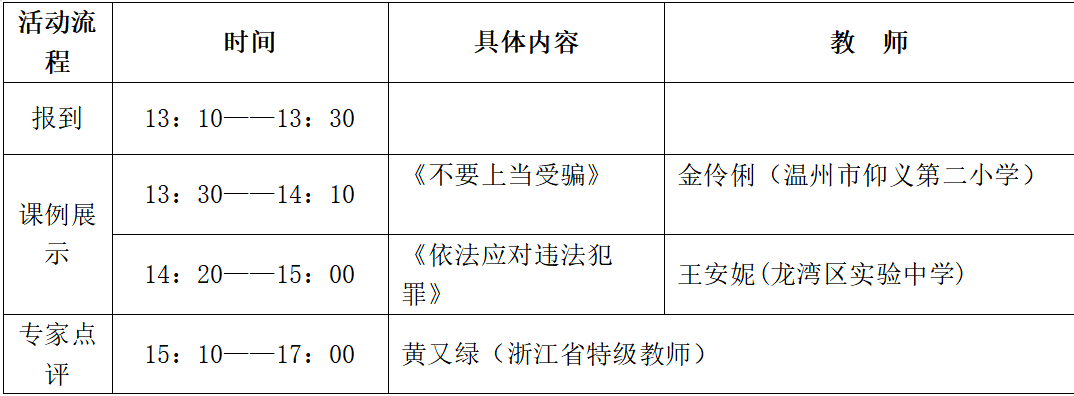 二、参加对象:温州市黄又绿名师工作室、温州市王义娅名师工作室、龙湾区王小凤名师工作室学员、龙湾区初中社会法治3年内新教师