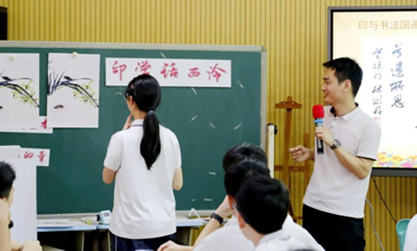 郑法阳老师以《印学话西泠》敲开了这场教研大会的第二章,其精湛的技艺和深入浅出的讲解,引领学生们走进了篆刻艺术的世界。他结合八年级学生的学习特点,巧妙地将诗词与篆刻相结合,不仅让学生们了解了篆刻的历史变迁,更让他们深刻感受到了“西泠印社”在书法篆刻界的崇高地位以及吴昌硕作品的独特魅力。在郑老师的指导下,学生们积极参与印稿设计实践,并在老师的刀法演示下,对即将到来的“刻印”课程充满了期待。