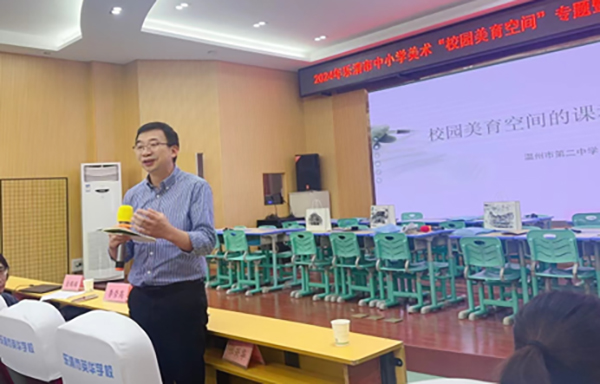 温州市名师孟勇老师则为大家带来了《校园美育空间的课程化实践》的专题分享。他强调,校园美育空间是校园文化的重要组成部分,是提升学生审美和人文素养的重要途径。他通过丰富的案例和深入的分析,向大家展示了如何将美育与生活相融合、与校园文化空间建设融合、与美术课程建设相融合,让艺术真正走进学生的生活。