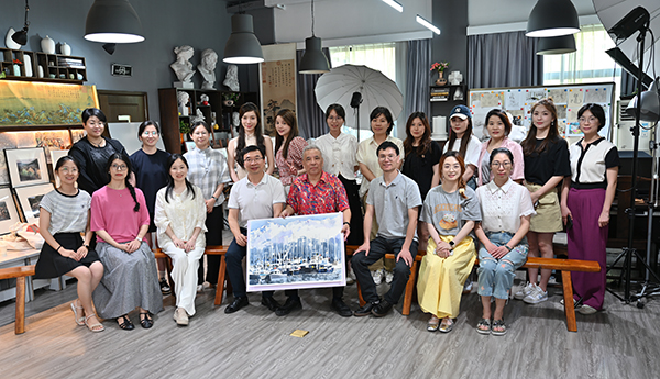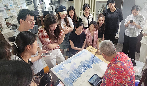 第三个活动环节是面对面地现场观摩李利民老师的绘画创作过程。面对蓝天雪山大海,重重船泊停靠的拉斯维加斯港口写生内容,正当大家惊呼画面事物之复杂、让人眼花缭乱之时,李老师则有条不紊地挥手而作,普兰、湖蓝、钴蓝、玫红等颜色在李老师的画中听话乖巧地摆放在画面上;画面中的事物远近有度,笔触潇洒又细腻,点线面和谐相处,真可谓意在笔先,笔随意动。李老师演绎了点线面在创作中的构成与应用,绘画不是临摹,而是以对象为母题,提炼强化,取舍并用,强调对画面感受,用点线面对画面的进行重组和情感表达,在主观意图与写生对象之间构建形色世界的过程。