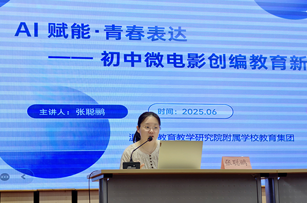 温州市教育教学研究院附属学校教育集团张聪鹂老师以《AI赋能·青春表达--初中微电影创编教育新范式》展开专题讲座。张老师分享了制作微电影的各个AI及不同功能。AI不仅是工具,更是创意伙伴,实现传统手段难以企及的艺术表达。为在场的老师打开了创作新思路。