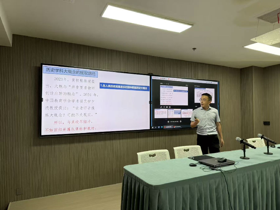 泰顺县北辰学校王苏昶老师作《历史学科大概念教学》观点阐述。他扼要阐述历史大概念的表现形态、本质属性,明确“大概念不是零散知识点,而是统领学科知识的核心观念”,并提出三大提取路径:在人类历史长时段脉络中把握规律、在课标精准研读中锚定方向、在教材深度解读中挖掘内核。他特别强调历史学科大概念的提取与其绞尽脑汁,不如回归并遵从课标和教材,初步学会在唯物史观的指导下看待历史。
