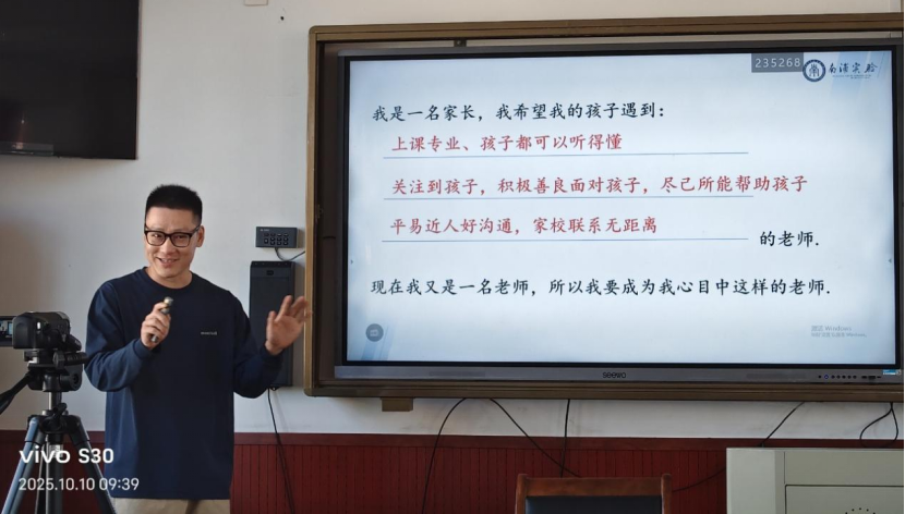 紧接着,童宗雨老师以《教学相长,评价落实》为主题,分享了他在课堂教学与评价实践中的探索与感悟。他认为,从换位思考的角度思考,如果你是家长,你希望你的孩子遇到怎么样的老师?童老师提出以下几点期待