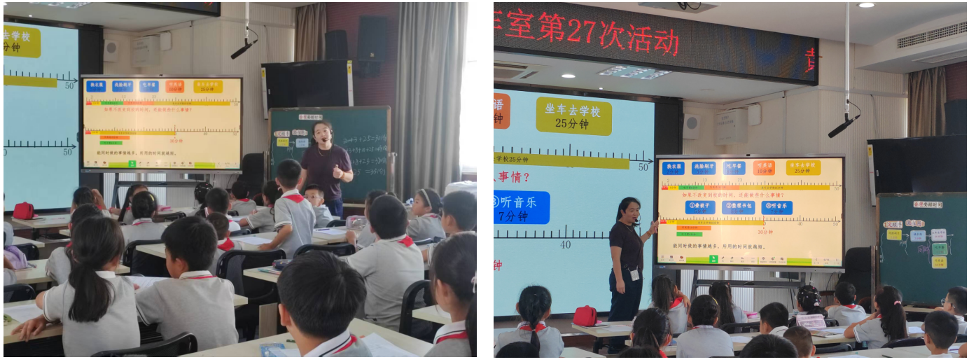 活动在邵碧芬老师执教的四年级《合理安排时间——沏茶问题》中拉开序幕。邵老师以学生熟悉的“早晨起床到上学”情境导入,引导学生通过绘制流程图、讨论时间安排,逐步感悟“定顺序”“同时做”的优化思想。课堂上,学生从最初的48分钟方案,逐步优化至30分钟,思维在对比、质疑与重构中不断进阶。邵老师巧妙运用时间轴帮助学生感知“并行做事”的节约效应,并将数学与生活紧密联系,让学生在巩固练习中体会“优化思想”的现实价值,真正实现了“小课堂,大智慧”。