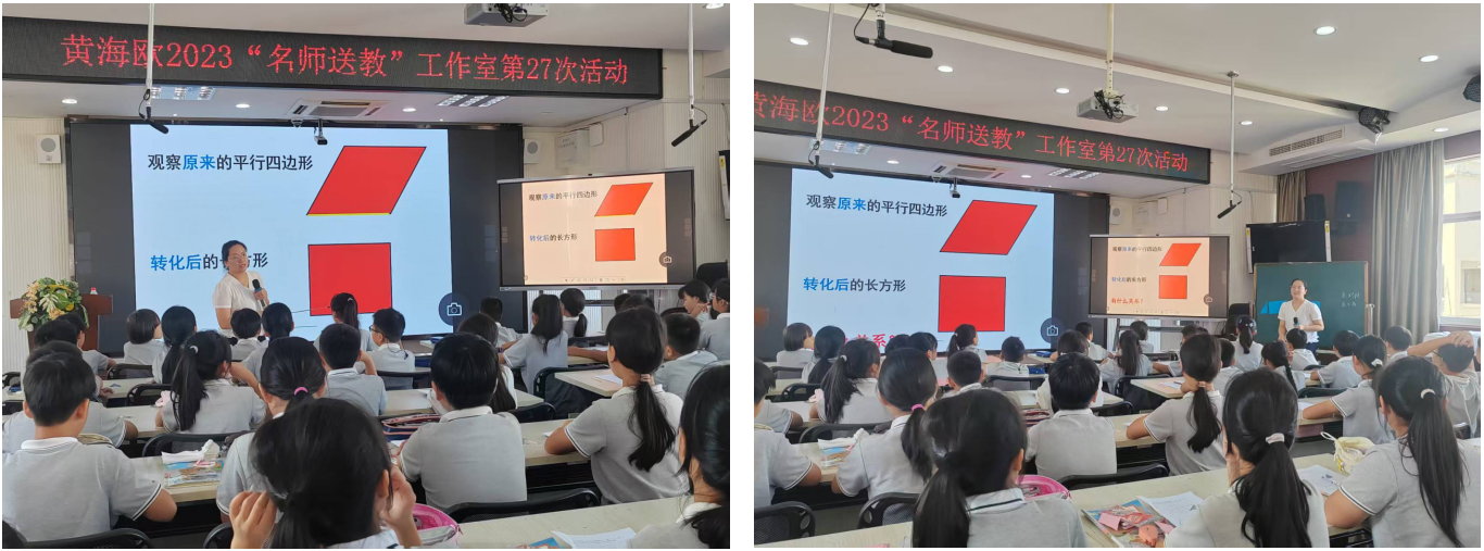 紧接着,张建红老师带来五年级《平行四边形的面积》一课。张老师基于学生前测中出现的“底×邻边”“数格子”“转化成长方形”等多元思路,引导学生通过剪拼、平移等操作,自主发现“底×高”的算理依据。课堂中,学生不仅理解了面积公式的来源,更在“等底等高”“面积相等是否一定等底等高”等思辨性问题中深化了对图形关系的理解,体现了“为思维而教”的教学追求。