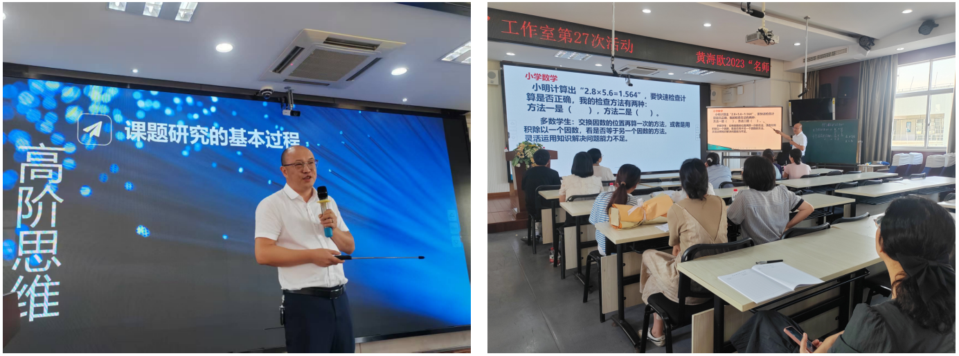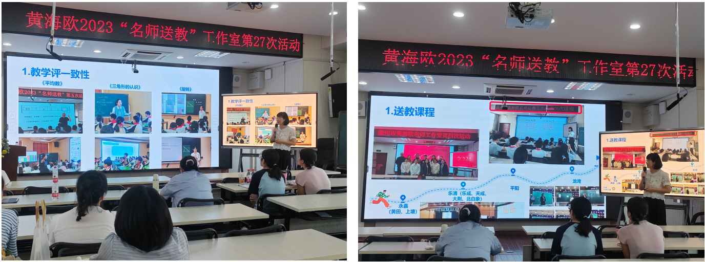 在活动的最后环节,黄海欧导师以《有缘相遇 心生欢喜》为主题,系统梳理了工作室自2023年9月成立以来的研修历程与成果。她指出,工作室以“主题引领—课例承载—研讨深化—成果凝练”为研修模式,通过送教下乡、联合教研、读书分享、课例研讨等多元路径,推动学员在教学设计与课堂实践上实现跨越式成长。