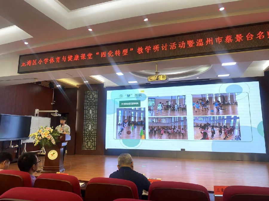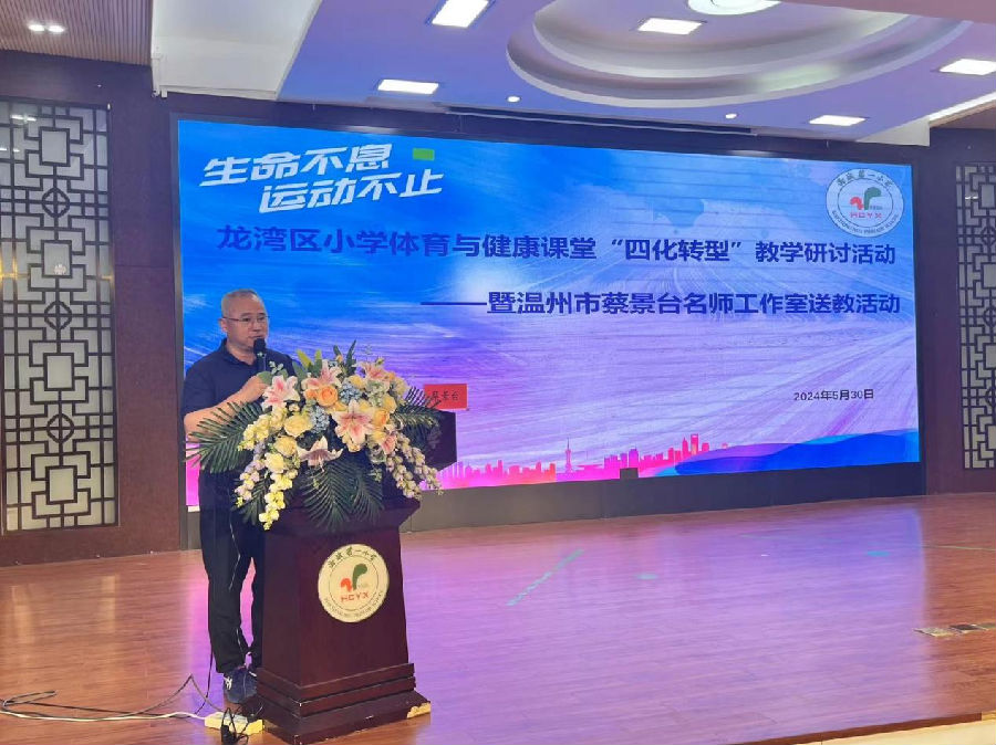 5月30日上午温州市蔡景台名师工作室送教活动暨2024年龙湾区小学体育与健康课堂‘四化转型’教学研讨活动在龙湾区海城第一小学成功举办。蔡景台名师工作室全体学员、龙湾区海城一小设站学校体育教师以及龙湾区各校小学体育教研组长参与本次活动。本次活动分为教学研讨、专题讲座与专家指导三个部分,旨在推进体育课堂教学“四化”转型,培养教师专业素养,提升课堂教学效果。