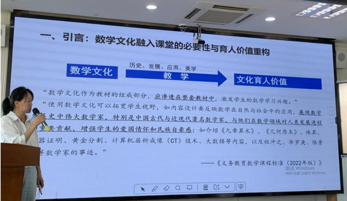 从“知识传授”到“文化育人”:数学不只是符号体系,它更是人类理性思维的结晶和文明传承的载体。李微珍老师结合自己的实践经验,分享了题为《数学文化浸润课堂:小学数学教育中的文化育人实践路径》的讲座。她从“数学文化融入课堂的必要性与育人价值重构”、“数学文化融入课堂的立体化框架设计”、“数学文化渗透课堂的四大核心策略”、“小学数学文化课程体系开发:从‘校本化’到‘特色化’”以及“实施保障与评价创新”这五个方面详细阐述了“数学文化作为教材的一部分,应当渗透在整套教材中,以激发学生的数学学习兴趣。”