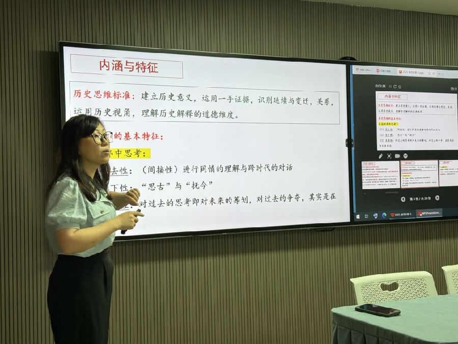 温州市第十七中学胡露西老师作《与历史对话 为未来思考》读书分享。她从书本国内外研究现状、历史思维的内涵特征、能力体系建构原则、实践培养方略四个维度展开,提出极具启发性的观点:历史思维是教学教学的核心,历史时序的“过去性、当下性与未来性”,历史教育的核心价值。在培养路径上,他领悟到追求有意义的历史教育、以理解为中心的历史学习、以问题促思维的历史学习、基于史料的教与学。引发全场对“为何学生爱历史却不爱历史课”“如何让历史思维真正落地课堂”的深度思考。