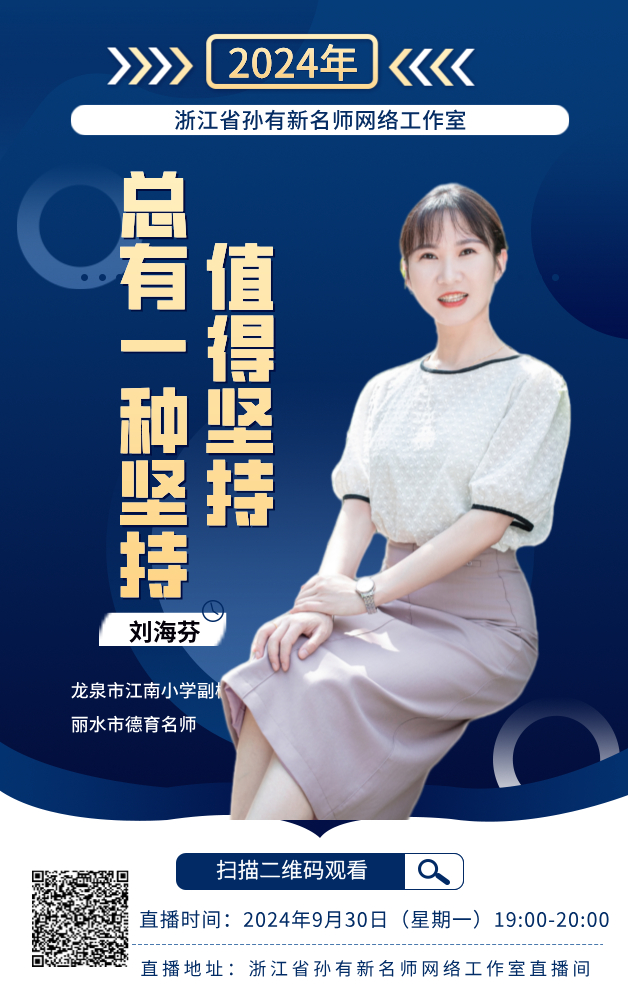 刘海芬,浙江省孙有新名师网络工作室学科带头人,龙泉市江南小学副校长,高级教师,丽水市德育名师,浙江省心理健康A证教师,国家二级心理咨询师。